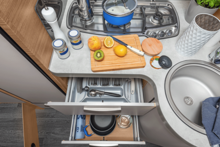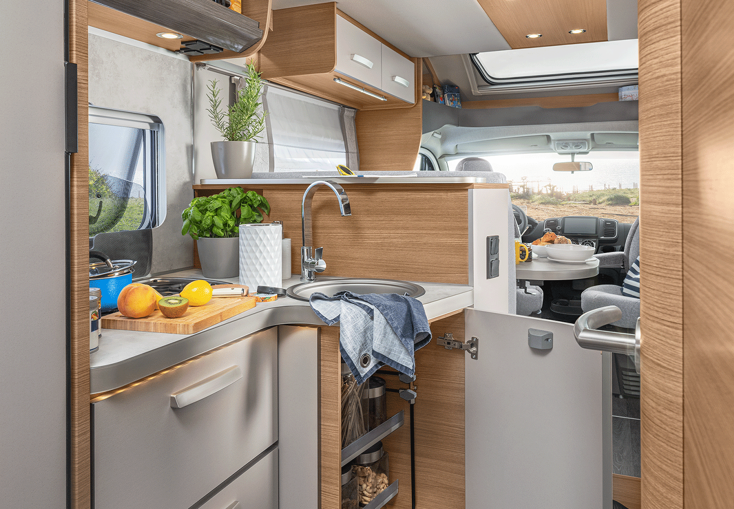 Der durchdacht geschnittene Wohnraum bietet großzügige Bewegungsfreiheit und dank serienmäßigem Seitensitz auch genügend Spielraum für die ganze Familie. Die L-Sitzgruppe inklusive verschiebbarem Einsäulenhubtisch schafft zusätzlichen Wohnraum & ermöglicht optimale Bewegungsfreiheit.
