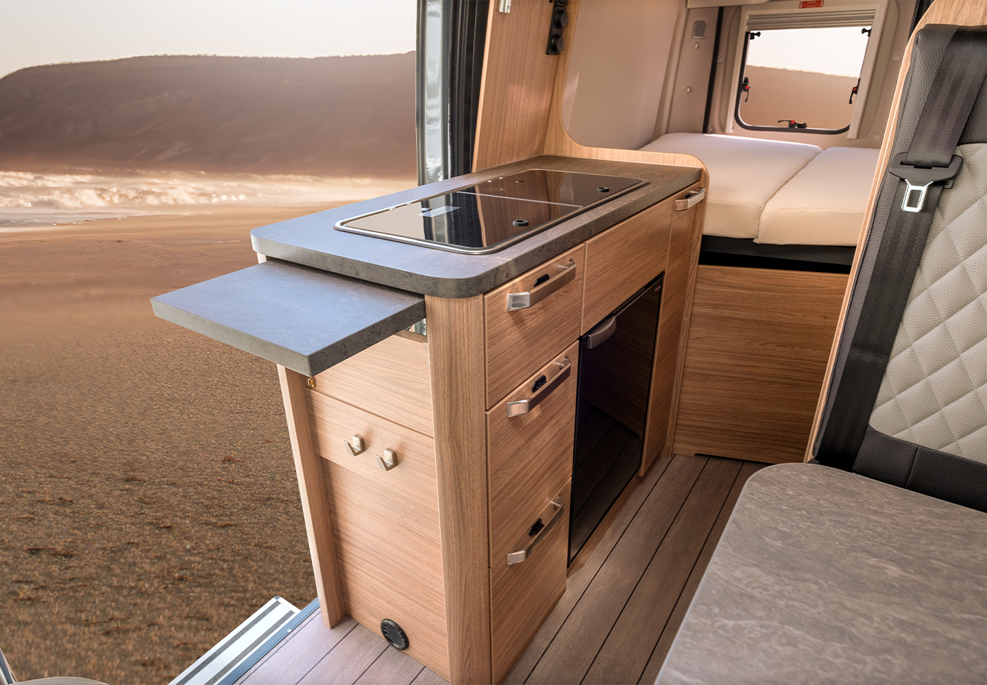 Kochen - Stilvoll kochen für unterwegs. Im CaraBus zu kochen macht überraschend viel Spaß. Das stimmige Möbeldesign mit abgerundeten Kanten und weicher Linienführung fügt sich perfekt ins Raumkonzept ein.
