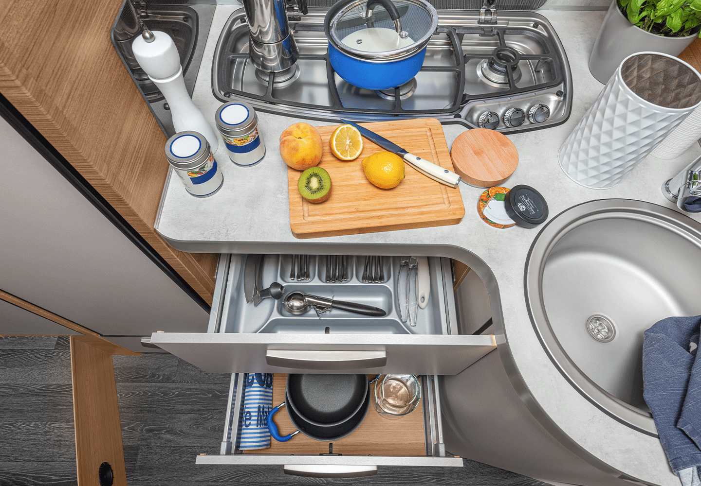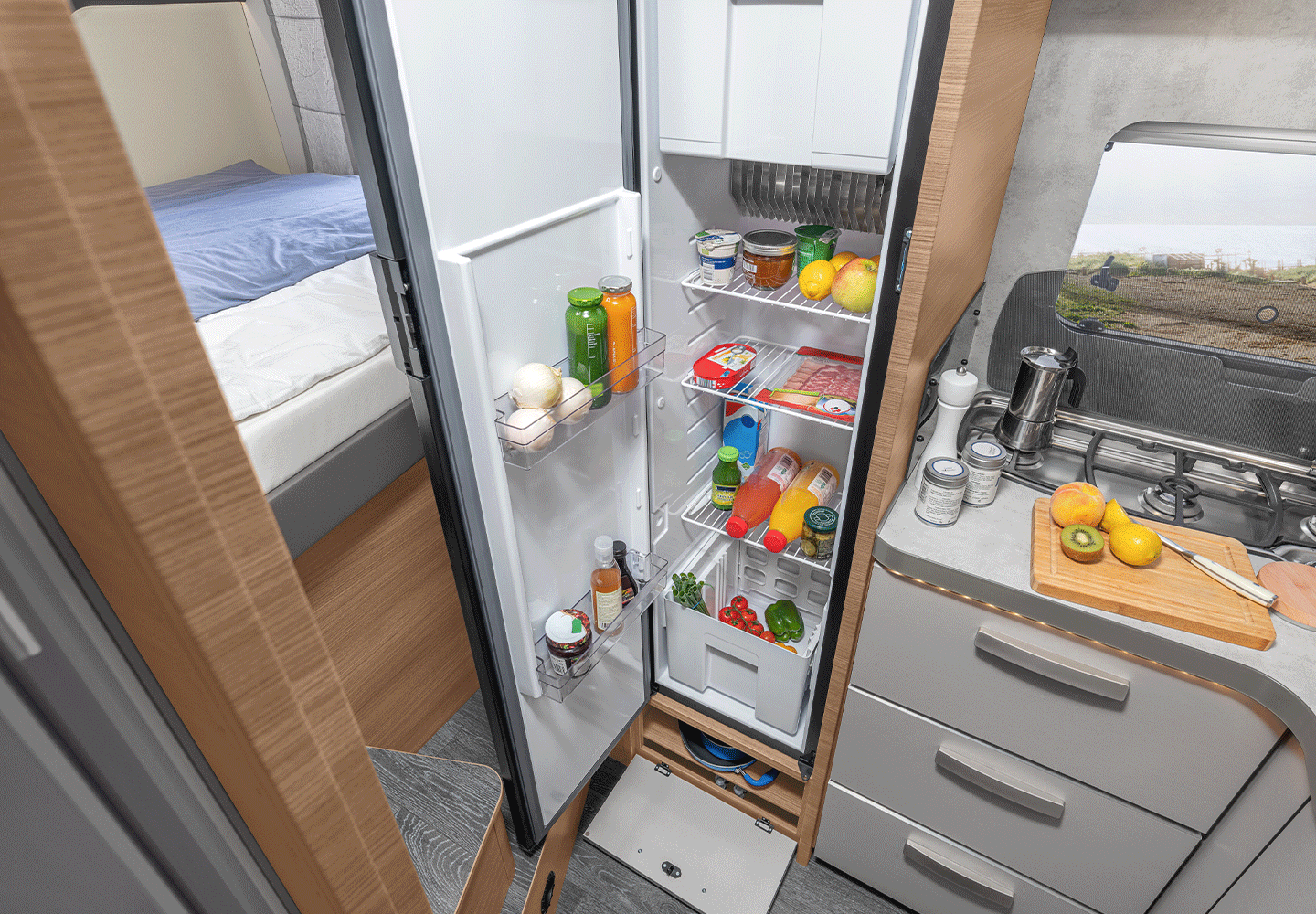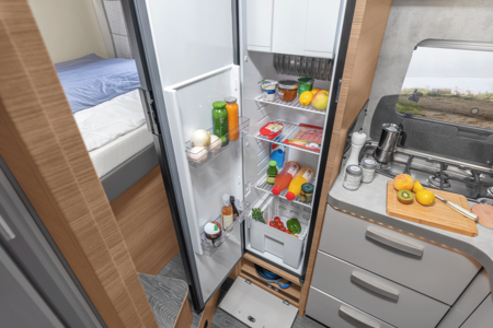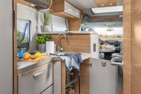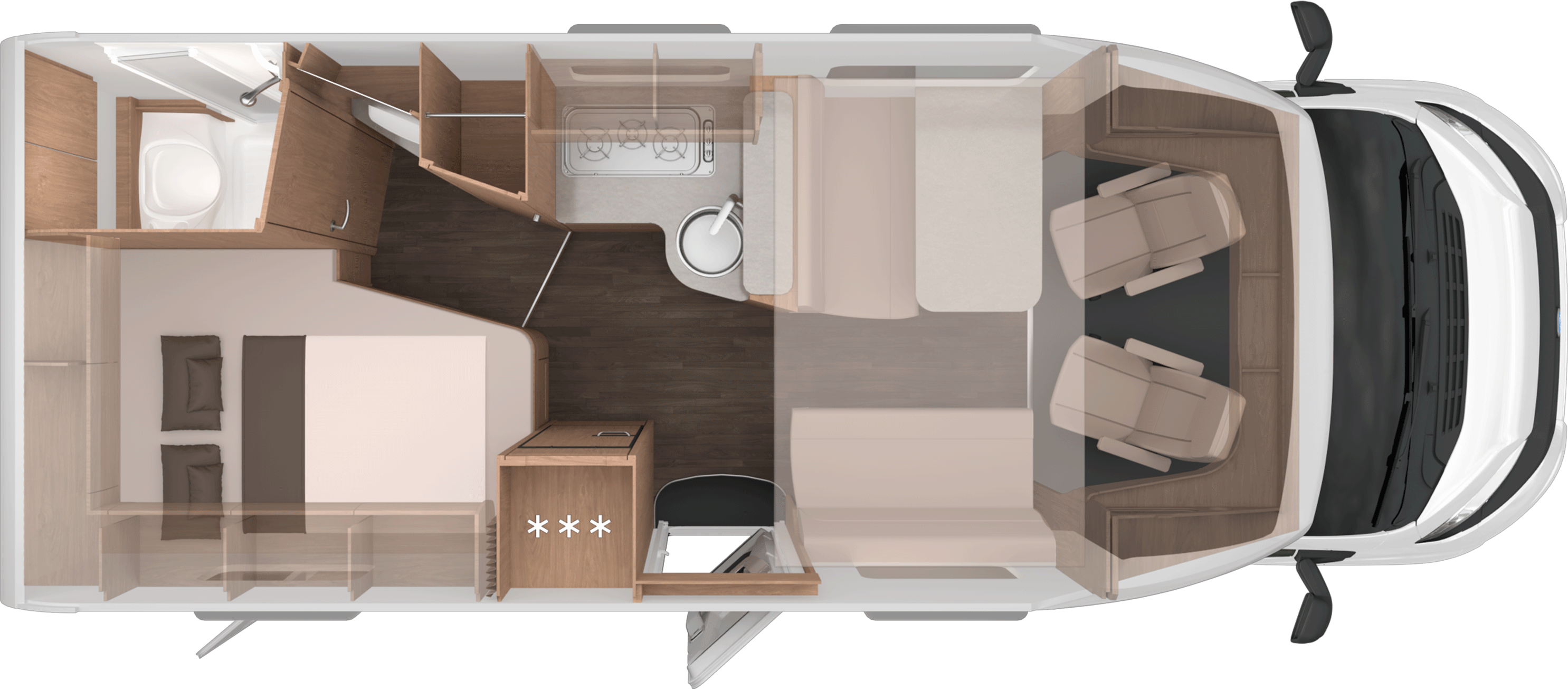De doordacht ingedeelde woonruimte biedt royale bewegingsvrijheid en dankzij de standaard zijzit ook voldoende ruimte voor het hele gezin. De L-zitgroep met verschuifbare éénpoots heftafel creëert extra leefruimte en zorgt voor optimale bewegingsvrijheid.