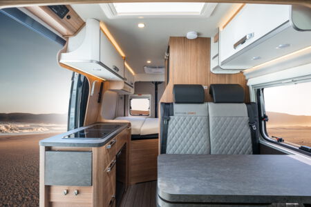 Wohnen - Geradlinig und durchdacht. Kompakte Bauweise, schöne Linienführung und viele Details in Serie. Der Essbereich im CaraBus lässt keine Wünsche offen. Drehbare Sitze für Fahrer und Beifahrer machen aus der Dinette für zwei schnell einen Essbereich für vier Personen.
