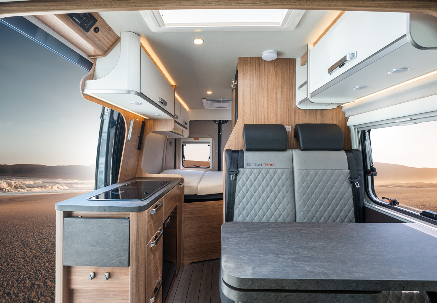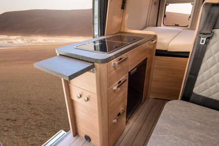 Kochen - Stilvoll kochen für unterwegs. Im CaraBus zu kochen macht überraschend viel Spaß. Das stimmige Möbeldesign mit abgerundeten Kanten und weicher Linienführung fügt sich perfekt ins Raumkonzept ein.